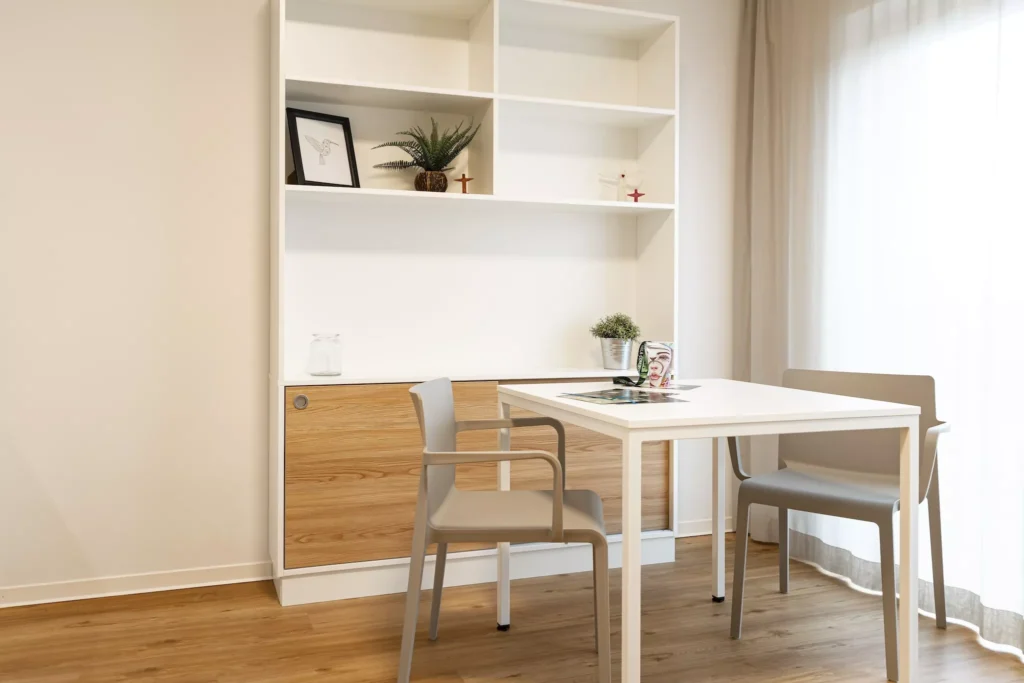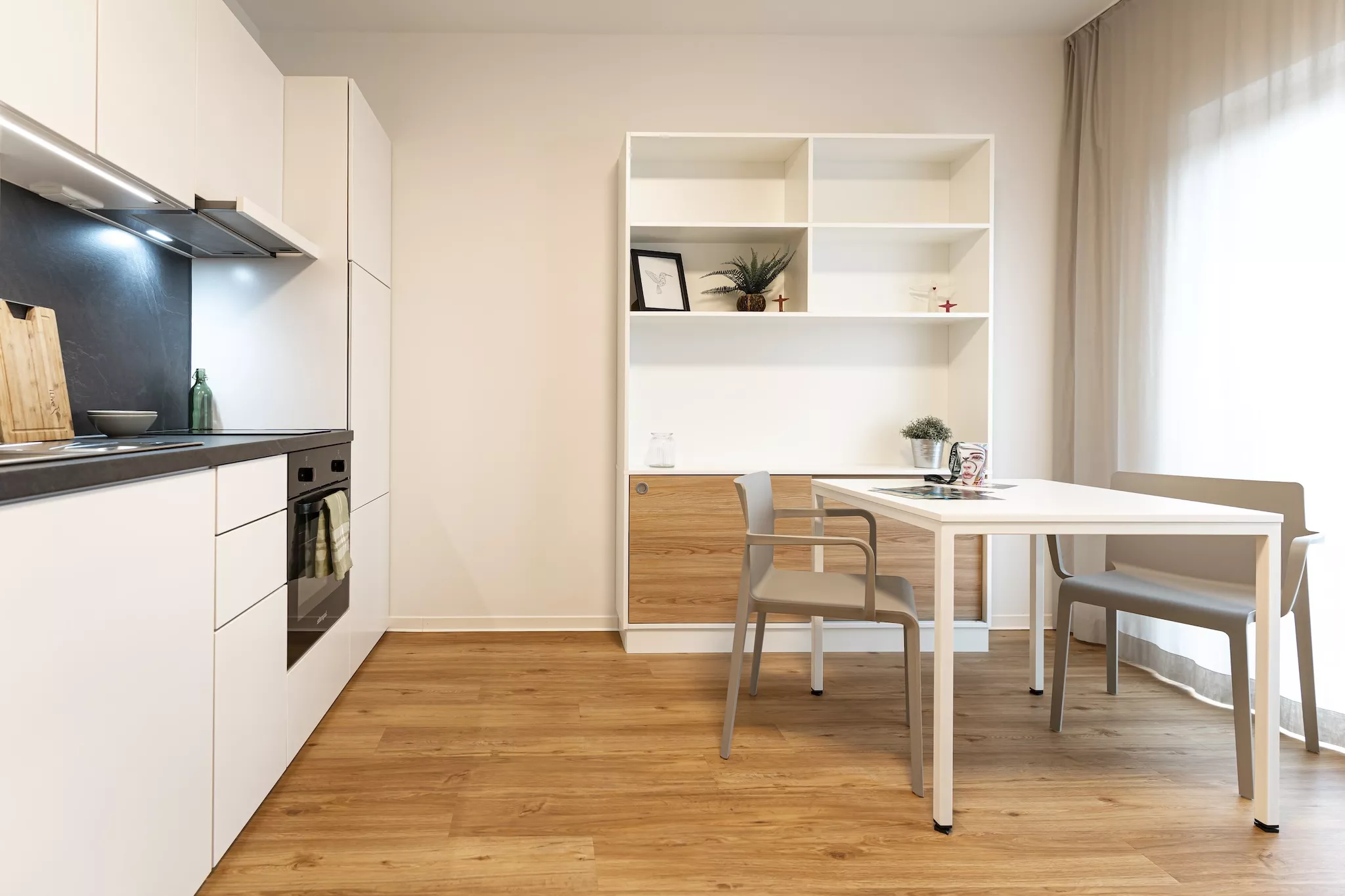 Our apartments are always fully furnished with everything you need! A high quality kitchen, your own stylish bathroom and a cozy bedroom and living area with a separate workspace. Here is your home.